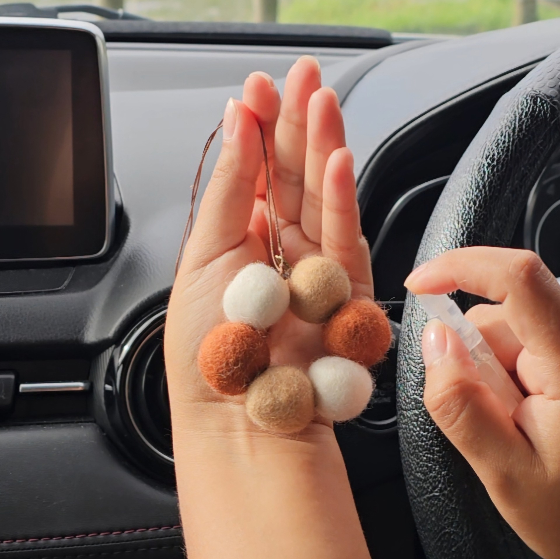Tips & Caution: Apply a few sprays directly onto the wool balls and refresh as needed (one spray goes a long way) A double knot is recommended. Spray your car diffuser before hanging it in your car mirror, and make sure the oil does not touch your car's surfaces or parts, as it might cause damage.