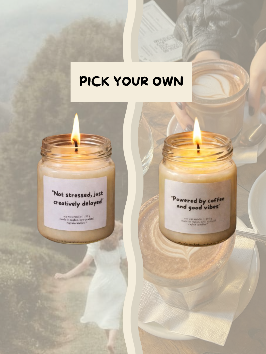 PYO- Pick Your Own Bundle and Save $ Kindled Quotes – Every candle carries a moment, a thought, a feeling. A collection of playful, quirky, and thoughtful candles designed to brighten your space and your mood. Each candle carries a unique quote and scent, sparking a little joy, a smile, or a moment of pause. Perfect for cozy evenings, creative energy, or simply reminding you that your space deserves warmth, personality, and a touch of fun. Each one has been carefully crafted from the scent to the quote it carries. We've poured intention and care into every detail, so that each flame holds a moment just for you. Description: 150g soy wax candle (ea) cotton wick (ea) up to 35hrs burn time (ea) handmade in Raglan This bundle contains 2 of your favourite quote candles.